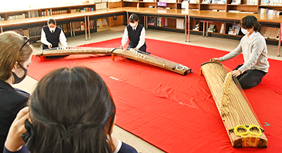 日高高校の箏曲部は19日の昼休み、学校の図書館で新春恒例の弾き初め会を開いた。