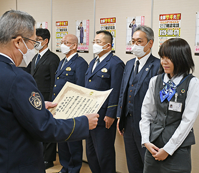 この日、片山さんは柿谷真樹人統括支店長とともに同署の署長室を訪れ、津田陽三署長が感謝状を贈呈。「一歩踏み込んでの声かけは勇気のいること。本当にありがたい。今後もよろしくお願いします」と述べ、柿谷支店長は「ネットを悪用した犯罪。私たちのお声かけが被害の防止につながる。このような活動を通じ、これからも地元、お客様に貢献できれば」、片山さんも「不安そうでしたし、おかしいなと思いました。お客様をお守りするという意識を持って仕事をしています。被害が防げてよかった」と話した。