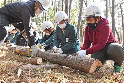 学校近くの松林に移動し、枯れた松をチェーンソーで切り倒す作業を見学したあと、のこぎりで細かく伐採する作業に挑戦。太い枝を頑張って切り、トラックへの積み込みも手伝った。