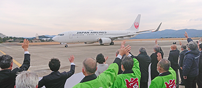 式典終了後には二階氏や出張の日裏勝己印南町長、一般客ら約40人が臨時便に搭乗。ほかの式典出席者は空港のエプロンから臨時便に手を振って見送った。