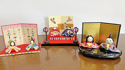 ちりめん雑貨は玄関先などの小ペースにも飾れるコンパクトサイズの商品を多数取りそろえ。ちりめん細工のお雛さまとお内裏さま、薬玉が吊るし飾りになった、気軽に雛祭りを楽しめる吊りタペストリーもあります。価格は1650円から。