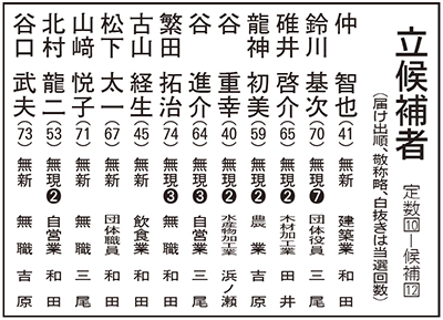 現職7人、新人5人が立候補し、2人超過の激戦を繰り広げる美浜町議選も、きょう11日が最後の戦い。最終盤の情勢は、現新3人が上位を争い、下位は現新6人が入り乱れてまれにみる混戦模様。上位の得票で大きく変わるが、安全圏は350~400票、当落ラインは200票台との見方が多く、当選圏内をめぐる攻防は、最後まで予断を許さない状況となっている。