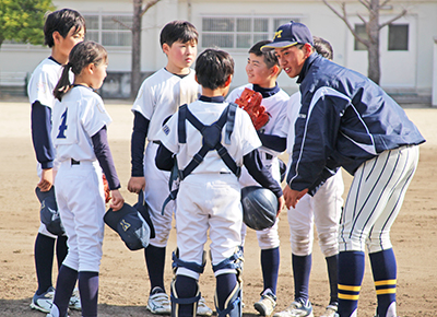 少年野球チームの三百瀬千鳥と湯川クラブの練習試合が12日、南部高校で行われ、同校硬式野球部のメンバー10人が両チームに分かれて采配を振るった。