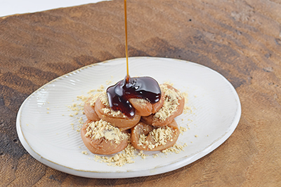 黒蜜きなこ梅は、種なしはちみつ梅に付属のきな粉をまぶし、黒蜜をかけて味わう和菓子のような梅干しです。梅干し界の新革命ともいえる斬新な商品をこの機会にご堪能を。