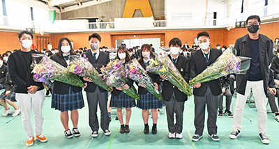 配布したのは日高、日高中津、紀央館、南部、和歌山南陵の5校。紀央館での贈呈式には3年生と假家会長、中尾貴宏副会長が参加。假家会長が「この花束には日高で栽培されたスターチスやカスミソウ、ガーベラなどがあり、スターチスは生産量日本一です。そんな地元の花を誇りに、『いつも前向きに』の気持ちで進路を歩んでください」とエールを送った。