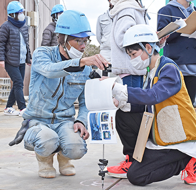 新しく通学路をつくっている工事であることや重機の油圧ショベルなどの説明を聞いたあと、測量機器を使って実際に作業を体験。ピンポールと呼ばれる専用の機器とタブレットを操作し、自動で正確な位置を示してくれる最新機器に「すごい」と歓声を上げていた。