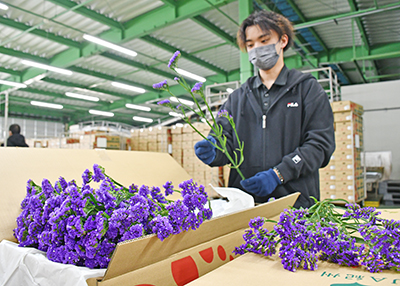 がいなポートでは、JA紀州中央花き花木部会の100軒ほどの生産者が約42㌶で栽培したスターチスを出荷しており、6日から20日までを彼岸の需要期とし、北海道から広島まで24の市場へ5、6万ケース(100本入り)の出荷を見込んでいる。
