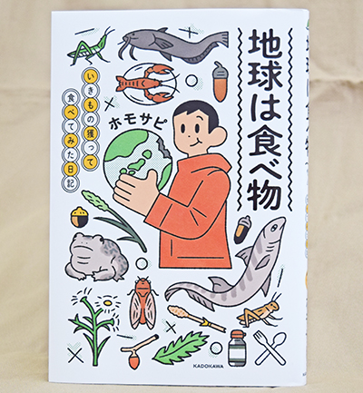 「地球は食べ物」は3章構成になっており、1章は「いきもの捕獲記」。カブトムシやクワガタ、クモ、バッタ、チョウなどの捕獲記録を掲載。2章は「ホモサピ人生記」で、生き物を好きになったきっかけやユーチューバーとして活動を始めたときのことなどを記している。3章は「ごちそう雑食記」。「ドジョウ丼」「小魚の石ころステーキ」「タニシのエスカルゴ」「オオスズメバチ炒め」などホモサピならではの一風変わったレシピが紹介されている。