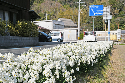 日高町志賀、柏地内の県道御坊由良線沿いで、約70㍍にわたってスイセンが咲いており=写真=、ドライバーらの目を楽しませている。