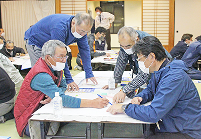 防災対策課の職員が7・18水害の教訓などを説明した後、北野口、上野口、下野口、岩内、古森、熊野の6地区に分かれてワークショップ。「地域でできる行動」「今後の取り組み・課題」などについて、参加者から「要支援者の手助けを確認する」「各家庭での避難準備の徹底」「高齢者への声かけ」などの意見が上がった。4月26日に開催する第2回のワークショップで各グループごとにまとめた意見を発表する。