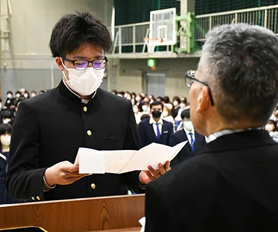 井上校長の入学許可宣言の後、入学生が宣誓。本科の新入生を代表し、生物応用化学科の岩本佑生さんが「先生方や先輩たちに学びながら、新しい仲間たちと友情を深め、互いに高め合い、責任ある行動をとれる人間になれるように、技術をもって国際社会に貢献し、柔軟な思考力を持った人間性豊かなエンジニアを目指して努力します」と述べ、専攻科からはエコシステム工学専攻の朱家佑弥さんが決意を示した。