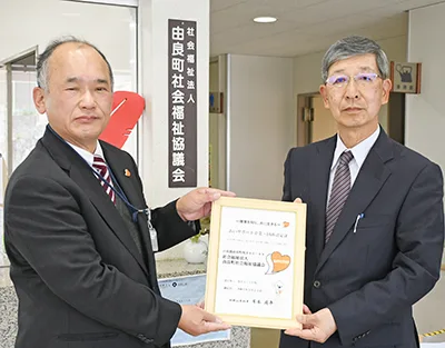 県の「あいサポート企業」に認定(22日付)された由良町の社会福祉協議会(山下和巳会長)に30日、認定証が伝達された。