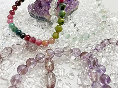 写真は、珍しい5種類の一連ブレス。①カラフルキャンディーのようなミックストルマリン②金運・事業運のエネルギー特性のグリーンファントム③ひとつの石の中に7つの鉱物が集まったスーパーセブン。水晶の中にインクルージョンされることにより、鉱物同士の力が相乗効果的に働きます。グラウンディング力も強くバランスのとれた石で、エネルギーアップ!(タンブル型)④ラウンド型のアメトリンファントム⑤細かいカットしずく型のアメジストファントム。