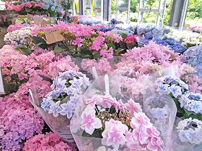 同店は、あじさい県下№1の品ぞろえを目指しており、昨年は262品種のあじさいを入荷しました。今年も新品種や珍しいあじさいなど約200品種以上のあじさいを入荷中です。