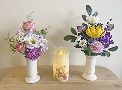 本格的な夏はすぐそこ! 暑さが厳しくなる前に、仏花の準備をしませんか。香華のアーティフィシャルフラワーの仏花はいかがでしょう。アーティフィシャルフラワーとは、本物の花をリアルに再現している高品質な造花。近年、日常を彩るアイテムとして、ブライダルや仏事などにと幅広く取り入れられています。同店では、ビシャコや一輪菊を用いた定番の仏花をはじめ、洋花を使った華やかな仏花もご用意。使ってほしい花や予算に合わせて作ることも可能です。気軽にご相談ください。価格は1つ4000円~。