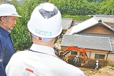 有田川町のミカン農園の斜面が崩れた現場や、河川が氾濫して大規模な住宅浸水被害があった海南市などを視察。みなべ町では収穫時期を迎えた東本庄地内の梅農家で発生した土砂災害現場を訪問した。裏山にある梅畑が崩れて住宅まで押し寄せており、担当課職員から説明を受け、重機を使って土砂が撤去される作業を確認した。