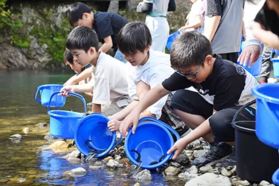 廣原組合長ら組合員5人が、30㌢から40㌢に育生された稚魚をバケツに入れ、児童たちはやさしく川へ放していった。脇野賢斗君(6年)は「ヌルヌルしてた。大きく育ったら釣って食べてみたい」と笑顔いっぱいだった。