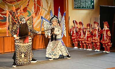 午後は公演で、保護者や地域住民も鑑賞。テーマは「はじめての京劇」で、京劇の特徴や見方などをレクチャーしたあと、京劇の古典「覇王別姫」から「剣舞」、「三国志演義」から「二将軍」などを上演。美しい舞や唄声、迫力の立ち回りを披露した。剣舞には女兵役、二将軍には張飛兵役、馬超兵役で児童が登場。舞台衣装を身に着けしっかりメイクもした児童が剣を手に舞台を盛り上げた。カーテンコールでは役者とともに児童も一人ひとり名前が呼ばれ、観客の拍手に応えた。