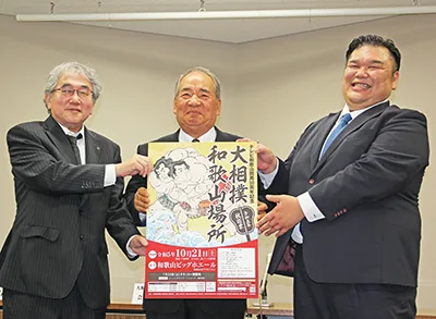 県民文化会館で開かれた記者会見には、同場所実行委員会の尾崎要二会長、大越康臣副会長、春日野部屋の岩友守親方(御坊市出身・元幕内木村山)が出席。岩友親方は「テレビで見るのとは違う距離の近さを楽しんでもらいたい。間近で見る雰囲気や迫力も感じてほしい」と呼びかけている。