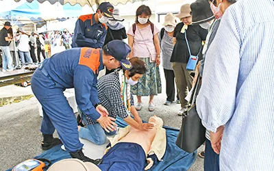 女性会の由良、日高、美浜町のメンバーやその家族ら約130人が参加。初めに同協力本部の櫻井教子3等陸佐の防災講話があり、自衛隊の災害派遣や、個人の備えなどについて聞いた。実演訓練では、自衛隊員から、災害時に役立つロープの結び方やしっかり水を防ぐ土のうの積み方、布と棒を使った止血法を教わりながら体験。停電時に役立つ発電機の使い方も学び、日高広域消防署員にはAEDの使用法や心臓マッサージなど心肺蘇生法を習った。