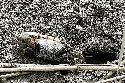 古賀教授はシオマネキを確認。同じ絶滅危惧種Ⅱ類のハクセンシオマネキは日高川干潟には比較的多いがシオマネキは少なく、古賀教授は「アシ原の拡大とともに減少しているのではないか」と話した。