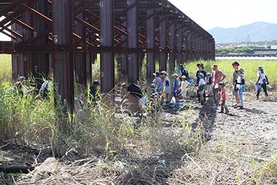 塩屋文化協会(溝口善久会長)の干潟の生き物観察会が6日に御坊市塩屋町北塩屋、日高川河口の干潟で開かれ、親子連れら44人が参加。干潟特有の珍しい生物などを採取し、観察した。