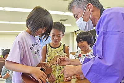 ボランティアで高齢者サロンや学童保育に楽器を使った楽しいひとときを届けている「いけちゃん」こと池﨑安基男さん(60)=日高町産湯=の体験会「いけちゃんとあそぼ!」が5日、日高町商工会館で開かれ、子どもたちがウクレレ演奏などを楽しんだ。