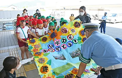 交通安全のひまわりの絆プロジェクトに取り組んだ日高川町のかわべ保育所年長児が26日、御坊署に開花記念のひまわりをモチーフにしたアート作品を贈った。