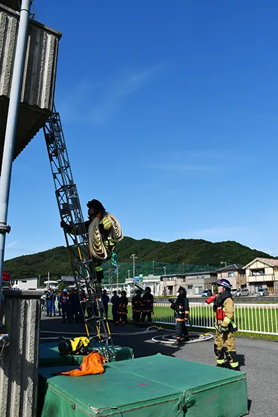 御坊市小隊は共同住宅の2階で火災が発生し、階段は使えず、逃げ遅れた人がいるとの想定で出動。はしごをかけて隊員が2階に上がり、逃げ遅れた人を救助した後、煙が立ち込める室内に入って消火した。