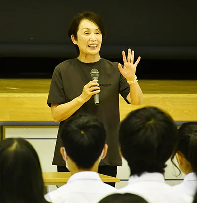 木村さんは授業中に大声を出す「まあちゃん」や友達に暴力を振るう「まさき」らと向かい合ったエピソードを紹介。生徒たちに「普通の反対は?」と問いかけ、生徒たちが「異常」「特別」などと答えると、「そういう言葉は『普通』があるから出てくる。だから普通は捨てました。他人と違うことに優劣や上下はない」と述べ、互いの違いを理解し、尊重し合う必要性を訴えた。