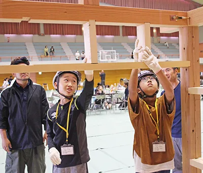 大工さんのブースでは小さな家づくりに挑戦。子どもたちはヘルメットをかぶって職人のアドバイスを受け、設計図を参考に木材を組み立てたり電動ドリルでビスを打ち付けたりして棟を上げた。和佐小学校4年生の細田隆乃介君は「木材が組み合わさって形になっていくのがとても楽しかったです」と話していた。