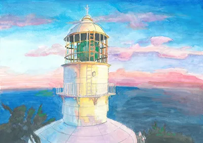楠本さんは小さいころから絵を描くのが好きで、4年生から御坊市内の絵画教室にも通っている。昨年も出品したが、入賞は初めて。今回の作品は高知県の室戸岬灯台を描いた。インターネットで題材を探していたところ、大海原を背景に夕日が当たってきらきらと輝いていた写真がきれいだったので選んだ。9月ごろに描き始め、水彩絵の具で色付けし、集中して4日ほどで仕上げた。灯台のレンズの部分を描くのが難しかったという。「濃い色を塗るのが難しかった。レンズはもっと透明だと思っていたけど、思っていたより濃く、頑張って塗りました。金賞を取れてうれしいです。来年も応募したい」と笑顔で話していた。