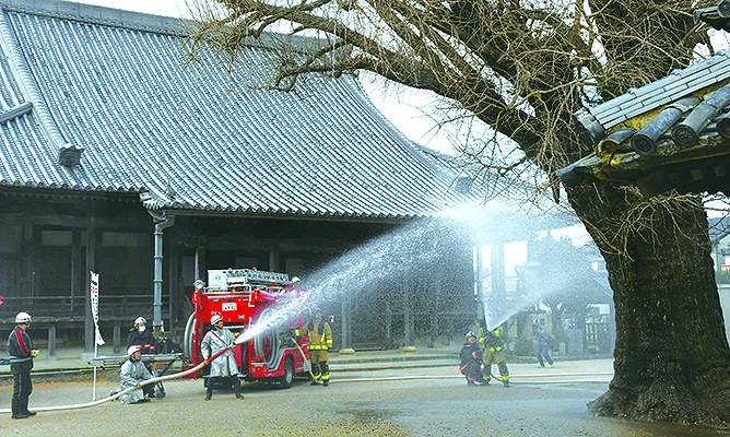 文化財防火デー(26日)を前に24日、御坊市消防は日高別院で訓練を行い、地元消防団と連携して放水を行った。