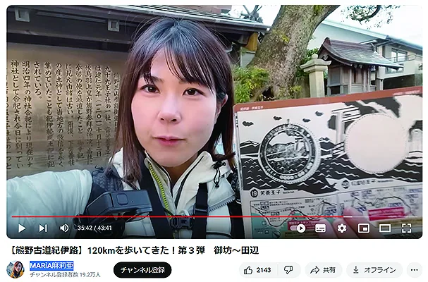 登山系ユーチューバーの麻莉亜(マリア)さんが、自身のユーチューブチャンネルで熊野古道紀伊路を歩く5泊6日の旅の動画を公開。和歌山市から田辺市まで120㌔の道中にある名所や歴史、おいしい料理など全3回、約2時間20分の動画に編集しており、紀伊路に詰まったたっぷりの魅力を発信している。