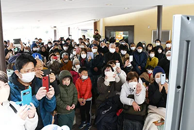 同SAでは55インチのテレビモニターを用意し、日高広域観光振興協議会が買い物客を対象に、関連グッズが当たるガラガラ抽選を実施。午前8時すぎの一番乗りから、10時を過ぎて人が続々と増え、発射予定時刻には会場を埋め尽くした。