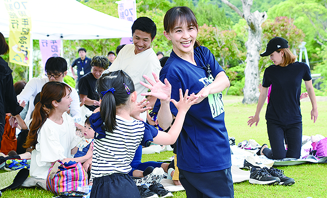 「みんなが笑顔に」をテーマに御坊市制施行70周年特別記念事業の子ども体操ピクニックが2日、御坊総合運動公園で開かれ、市内の3~5歳児と保護者24組61人が参加。岩出市出身の元体操日本代表選手田中理恵さんを迎えて、自宅で楽しく、気軽に続けられる運動を学んだ。