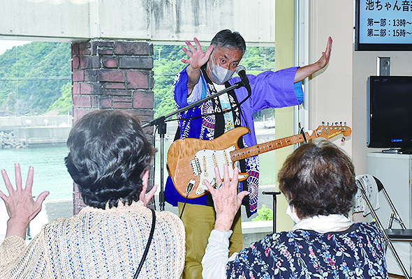 ボランティアで高齢者サロンや学童保育を訪ね、楽器を使った楽しいひとときを届けている「いけちゃん」こと池﨑安基男さん(60)=日高町産湯=の音楽イベント。今回は温泉館の利用促進へ一役買った。