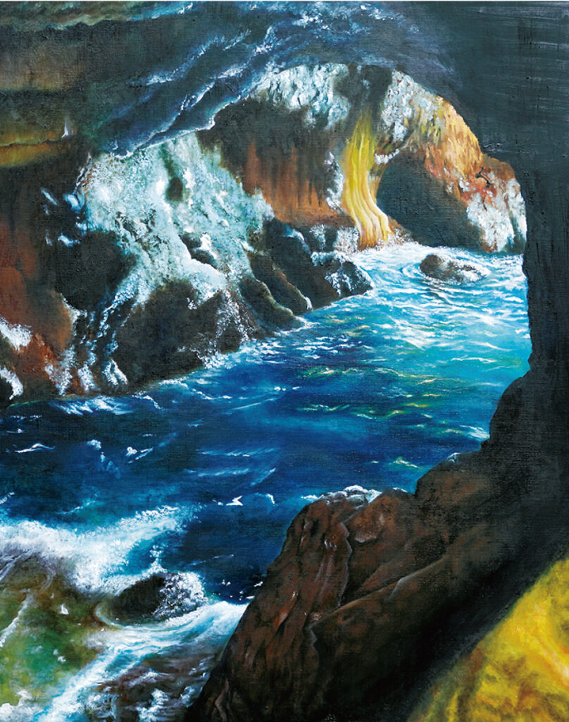 受賞作品は、F50号のキャンバスに油絵具で描かれた「洞窟」で、白浜町の三段壁洞窟を題材にしている。波しぶきを見たまま忠実に再現し、細かな筆遣いで仕上げた。岩肌は黒や白をはじめとする多様な色を駆使して描き、日の光による明暗を巧みに表現。洞窟内の暗さと外の明るさのコントラストが際立つ作品に仕上がった。