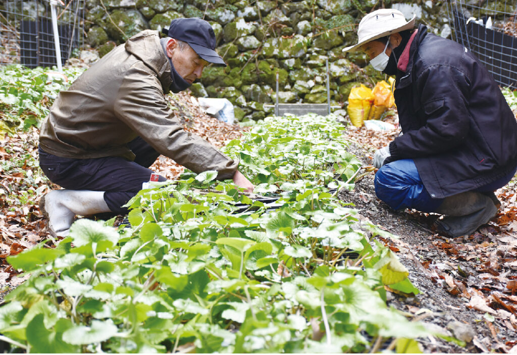 印南町真妻地区が発祥の「真妻わさび」の栽培を再興させようと、地元のまちづくり団体真妻やまびこ塾(山本育男塾長)と高機能炭和歌山研究所(中田稔所長)が昨年1月、田ノ垣内の耕作放棄地に定植した真妻わさびが順調に生育している。少量の湧き水でも栽培できるかの実証実験で、沈殿した泥を定期的に排出するなど工夫し、今のところ予想以上の出来。成果が出れば将来的にブランド産地としての生産量アップが期待される。