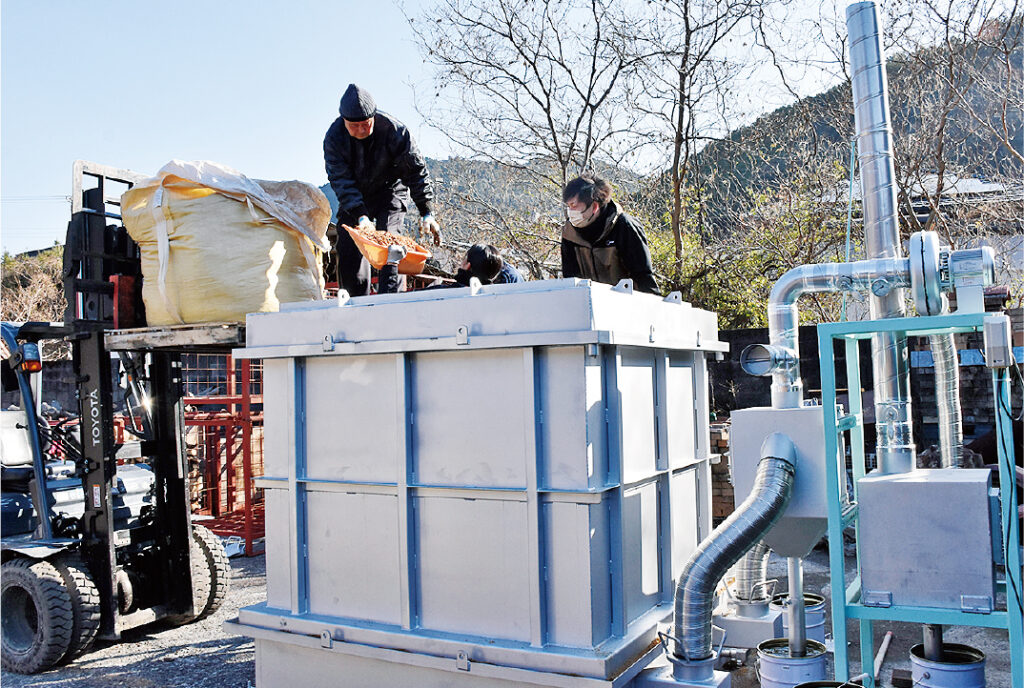 炭化は森林組合に委託して行う。剪定枝をチップにして、今回新たに導入した専用の炭化炉で炭にする。14日に行った試運転では、炉の購入先の高槻バイオチャーエネルギー研究所の島田勇巳所長らが取り付け、使用方法などを説明。実際に剪定枝チップを入れて稼働し、数時間で炭にしたが、冷却などして2日後に取り出した。