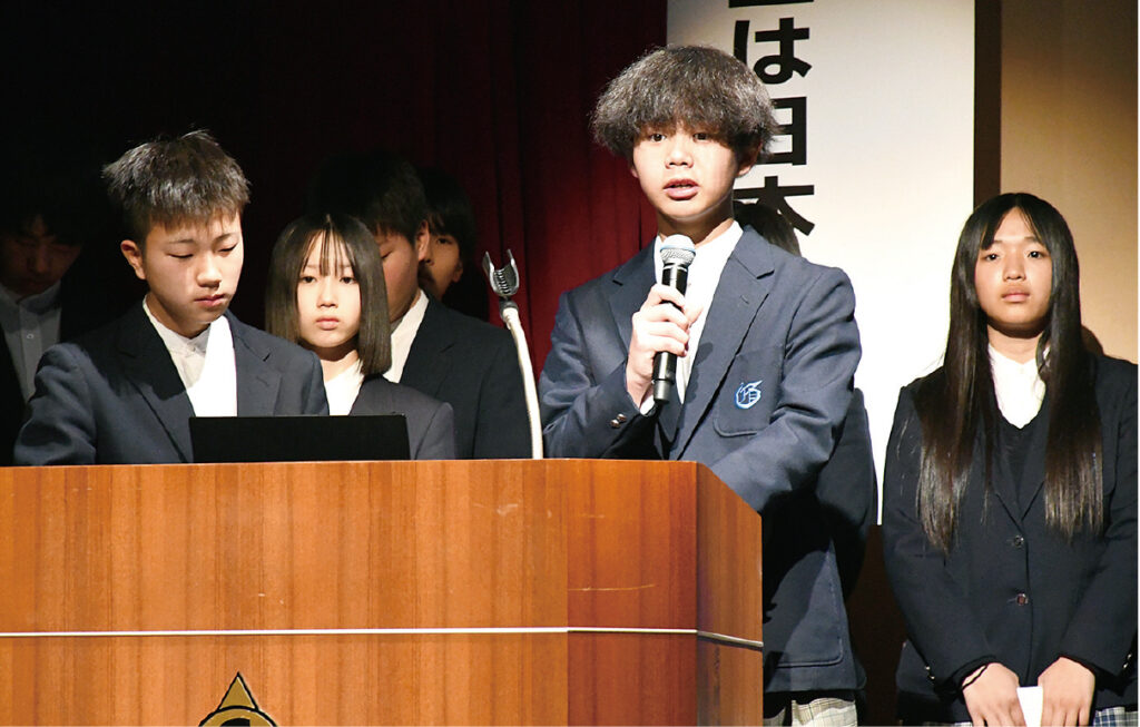 御坊中生徒の発表は「北方領土研修を通じて学んだことと伝えたいこと」をテーマに、3年生10人が登壇。「生まれ育った故郷に帰れないとしたらどんな気持ちになりますか」と参加者に問いかけ、ロシアとウクライナの戦争による影響などから北方墓参やビザなし交流が停止になっている現状を説明し、「実際に悲しい思いをしている国民がいるという現状を見過ごしてはいけない。何も知らずに、知らないままでいることが問題」と訴えた。