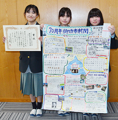 湯川中の表彰式では紀南教育事務所学校指導課の龍田俊樹さんから、グループで学習に取り組んだ足川麗香さん(2年)、川越緋真莉さん(同)、足川心優さん(1年)に賞状が伝達された。3人は昨年4月から11月まで、誕生70周年を迎えた御坊市の歴史やスターチス、小竹八幡神社、宮子姫などを調べ、縦109㌢、横78㌢の模造紙に「70周年御坊市新聞」のタイトルをつけてまとめ、写真やイラストを交えて紹介。課題は人口減少、空き店舗の活用などとし、希望する未来像に「人に優しく気づかいのできる、住みよい御坊」を挙げた。受賞に「まさか大賞になるとは思っておらず、とてもうれしいです。学習を通じて御坊の魅力が分かりました」と話していた。