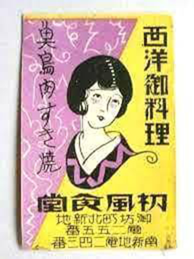 昭和初期のカフエーは、店の名前やロゴマークの入ったマッチが重要な広告アイテムだった。いまではマッチそのものもあまり見かけなくなったが、木村さんは5年ほど前、ネットで「西洋御料理 魚鳥肉すき焼」というコピーと女性のイラストがデザインされた初風のマッチの画像を見つけた。