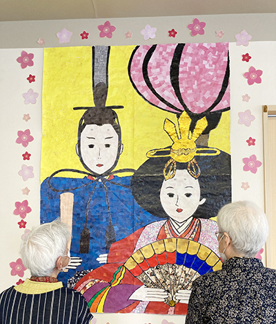 同センターでは、利用者のお年寄りの認知症予防や脳トレなどのため、季節に合わせた作品作りを行っている。今回は縦150㌢、横100㌢の大きなおひな様を利用者らで仕上げた。宮中の装いをイメージした上品できれいな男びなと女びなで、ピンクのぼんぼりを飾り、周りには桃の花も張り付けた。皆が集まるデイルームに飾られ、「私も孫のために飾ったよ」「淡嶋神社へ納めに行ったわ」など楽しそうに話していた。作業療法士の三池勝一さんは「紙を切る人、貼る人など皆様の得意な工程を提供することで、達成感を感じてもらえるように配慮しました」と話している。