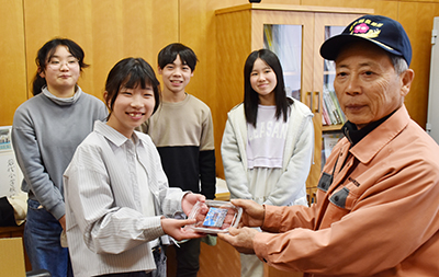 児童会長の殿畑ひなたさん、役員の上本葵央羽さん、石橋一真君、森口結衣子さん(いずれも6年)が校長室で尾﨑隊長に手渡し、殿畑会長は「被災地の皆さんにおいしく食べてもらいたいです」と思いを述べた。