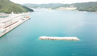 事業は、由良湾口に位置する蟻島の東約1㌔周辺で、南側は日高町柏の「ムロノキ鼻」と呼ばれる海岸付近に位置し、北側は神谷の株式会社駒井ハルテック和歌山工場付近にあたる。南側防波堤は延長100㍍、海底からの高さ約20㍍、地盤高(標高ゼロ)からは5・5㍍。北側は延長350㍍で、海底からの高さは同様に約20㍍、地盤高からは6・5㍍となっている。
