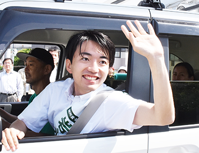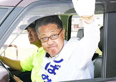芝候補は告示後から美浜、日高、由良の3町と日高川、印南、みなべの3町を交互に街宣。街宣カーからマイクを握り、「芝充彦です。県政で仕事をさせてください」と声を響かせてきた。知名度アップに向けて持ち前の軽いフットワークを発揮し、有権者を見つけると車を降りて駆け寄り笑顔で握手。町議経験11年の実績や前向きで情熱的な人柄をアピールし、日に日に手を振り返したり、声をかけたりしてくれる人が増えて、盛り上がりを感じている。自民党県連など5団体からの推薦をバックに、つながりのある郡内各町町議らの支援をはじめ、地元、同世代の友人、自身や子どもの野球関係者らの応援で、徐々に名前と顔が浸透。「知名度がないなか短期決戦でゼロからのスタート。手応えはなかなかつかみ切れないが、よくなってきている雰囲気は感じている」と話す。
