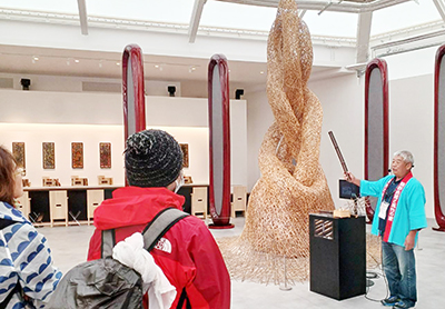 黒竹を守る会の出演は9日から14日まで一日3回。ブースには堺市の竹工芸家・4代田辺竹雲斎氏が循環を意識し、長さ2㍍の竹ひご2000本を編んで作った高さ4㍍を超える作品「無限」が展示されている。