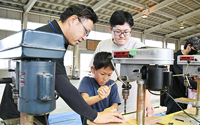 工具や工作機械で楽しく作業。昨年の水鉄砲に続いて参加した湯川瑛大君(川辺東小5年)は今年、横笛作りを体験し、「面白いです」と笑顔を見せていた。