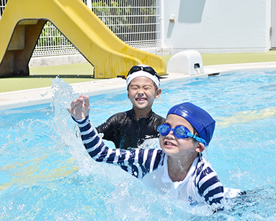 印南町西ノ地の町民プール遊水館が28日、オープンした。初日は梅雨明け後の真夏日となり、約20人の子どもたちが笑顔いっぱいに水しぶきをあげていた。